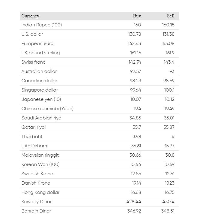 यस्तै युरो एकको खरिद दर १४२ रुपैयाँ ४३ पैसा र बिक्री दर १४३ रुपैयाँ ०८ पैसा रहेको छ। बेलायती पाउण्ड एकको खरिद दर १६१ रुपैयाँ १६ पैसा र बिक्री दर १६१ रुपैयाँ ९० पैसा रहेको छ। कतारी रियालको मूल्य एकको खरिद दर ३५ रुपैयाँ ७० पैसा र बिक्री दर ३५ रुपैयाँ ८७ पैसा रहेको राष्ट्र बैंकले जनाएको छ।