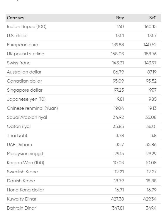 यस्तै युरो एकको खरिद दर १३९ रुपैयाँ ८८ पैसा र बिक्री दर १४० रुपैयाँ ५२ पैसा रहेको छ । बेलायती पाउण्ड एकको खरिद दर १५८ रुपैयाँ ०३ पैसा र बिक्री दर १५८ रुपैयाँ ७६ पैसा रहेको छ । कतारी रियालको मूल्य एकको खरिद दर ३५ रुपैयाँ ८५ पैसा र बिक्री दर ३६ रुपैयाँ ०१ पैसा रहेको राष्ट्र बैंकले जनाएको छ ।